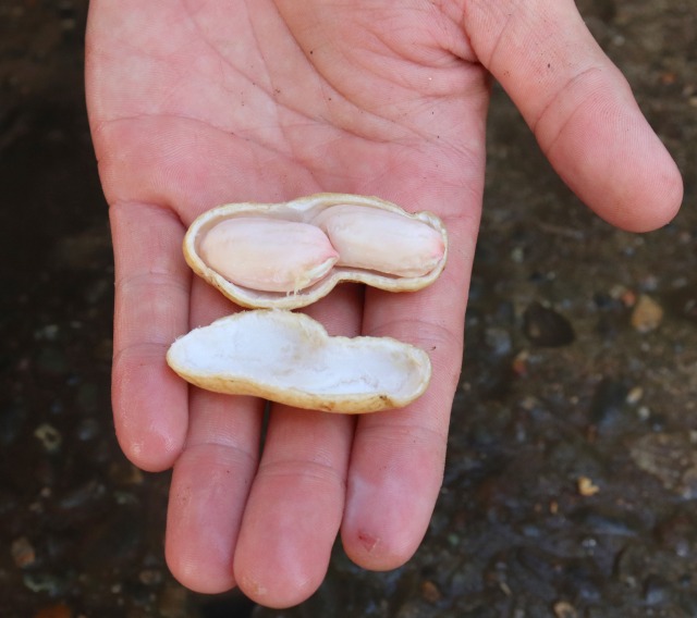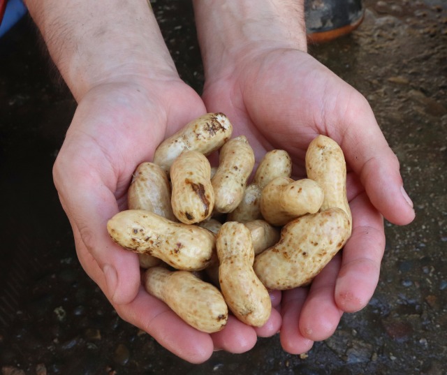 開花から100日ほどたったら試し掘りして、大きさや色を確認後、収穫作業に入る。脱莢、洗浄、選別して約1日半乾燥し、出荷する。「全て手作業で行う。特に脱莢は、実が割れないよう丁寧に外すので時間がかかる」と話す。