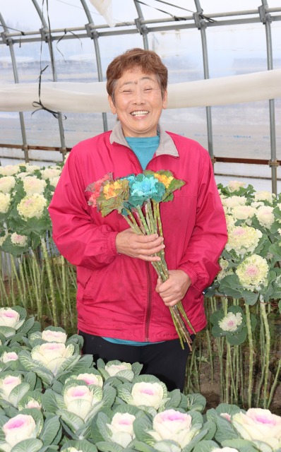 同JA園芸畜産課の瀬川友香さんは「池田さんのカラフルな葉ボタンが出荷間近になると、消費者から確認の問い合わせをいただく。また、実績検討会や圃場の見回りに欠かさず参加し積極的に情報を集めようとする勉強熱心な方。その場にいると、みんなが明るくなる盛り上げ役」と話す。
