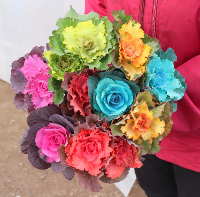 白系2品種で取り組む。収穫した葉ボタンの切り口を、切り花着色剤を入れた容器に1日浸して染める。花の色はピンクやレッド、オレンジやブルーなど多岐にわたる。